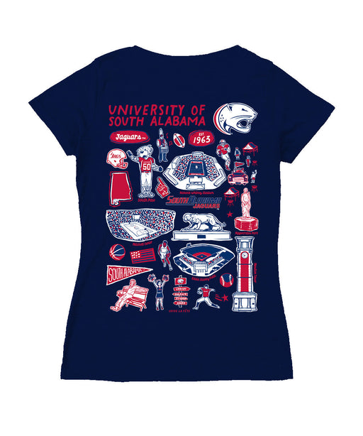 South Alabama Jaguars Hand Sketched Vive La Fete Impressions Icons T-shirt for Women
