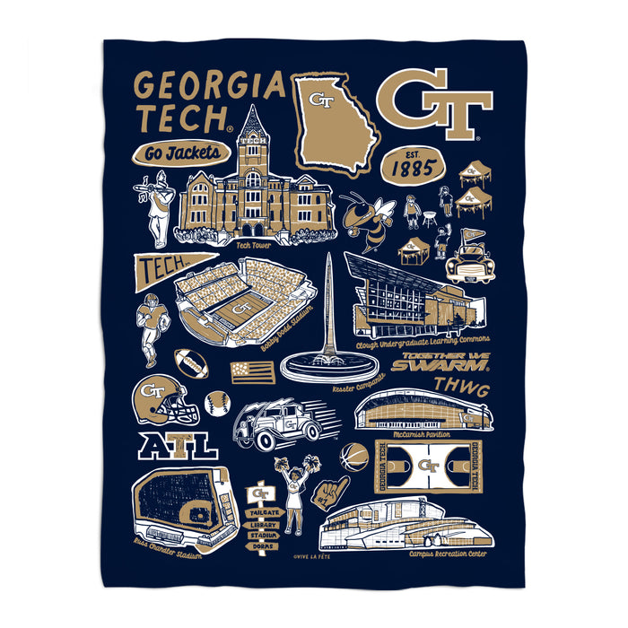 Georgia Tech Navy Hand Sketched Vive La Fete Impressions Artwork Blue Plush Soft Minky Blanket 36 x 48