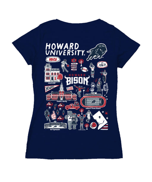 Howard University Bison Hand Sketched Vive La Fete Impressions Artwork Navy Women Cotton Short Sleeve V-Neck Tshirt