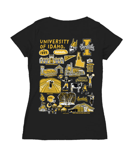 U of I Vandals Hand Sketched Vive La Fete Impressions Artwork Black Women Cotton Short Sleeve V-Neck Tshirt