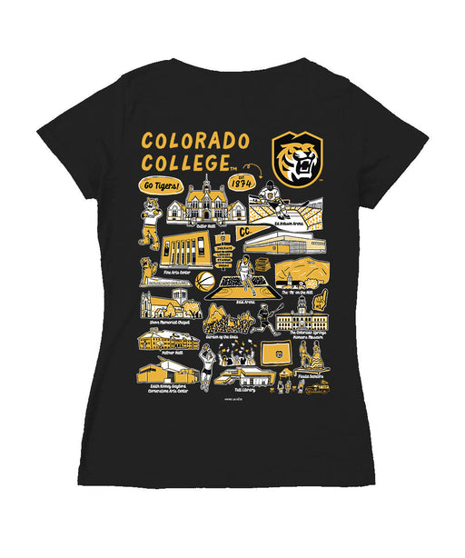 Colorado College Tigers Hand Sketched Vive La Fete Impressions Artwork Black Women Cotton Short Sleeve V-Neck Tshirt
