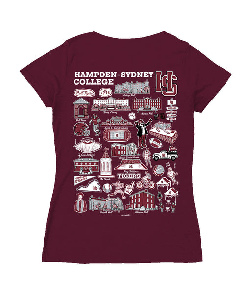 Hampden–Sydney TigersHand Sketched Vive La Fete Impressions Artwork Maroon Women Cotton Short Sleeve V-Neck Tshirt