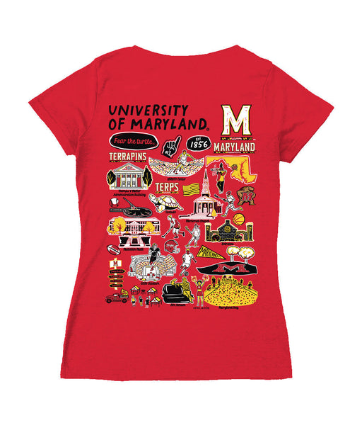 Maryland Terrapins Hand Sketched Vive La Fete Impressions Artwork Red Women Cotton Short Sleeve V-Neck Tshirt