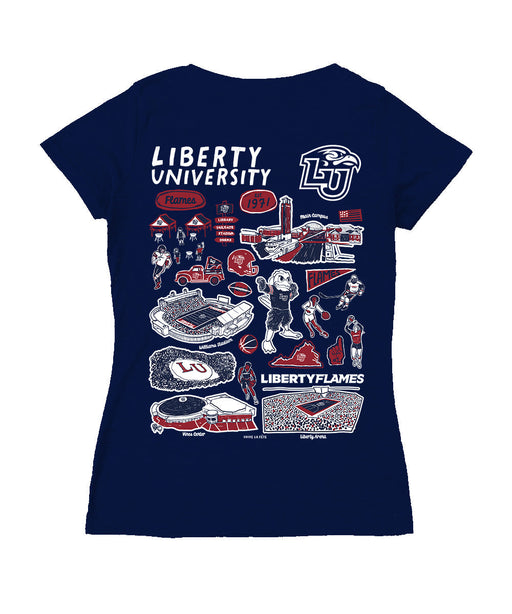 Liberty Flames Hand Sketched Vive La Fete Impressions Artwork Navy Women Cotton Short Sleeve V-Neck Tshirt