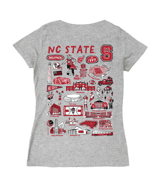 North Carolina State Wolfpacks Hand Sketched Vive La Fete Impressions Artwork Grey Women Cotton Short Sleeve V-Neck Tshi