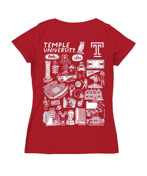 Temple University Owls TU Hand Sketched Vive La Fete Impressions Artwork Red Women Cotton Short Sleeve V-Neck Tshirt