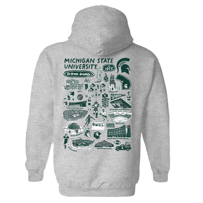 Back: A detailed, artistic print celebrating the most iconic places and traditions of Michigan State University making it a must-have for students, alumni, and fans!