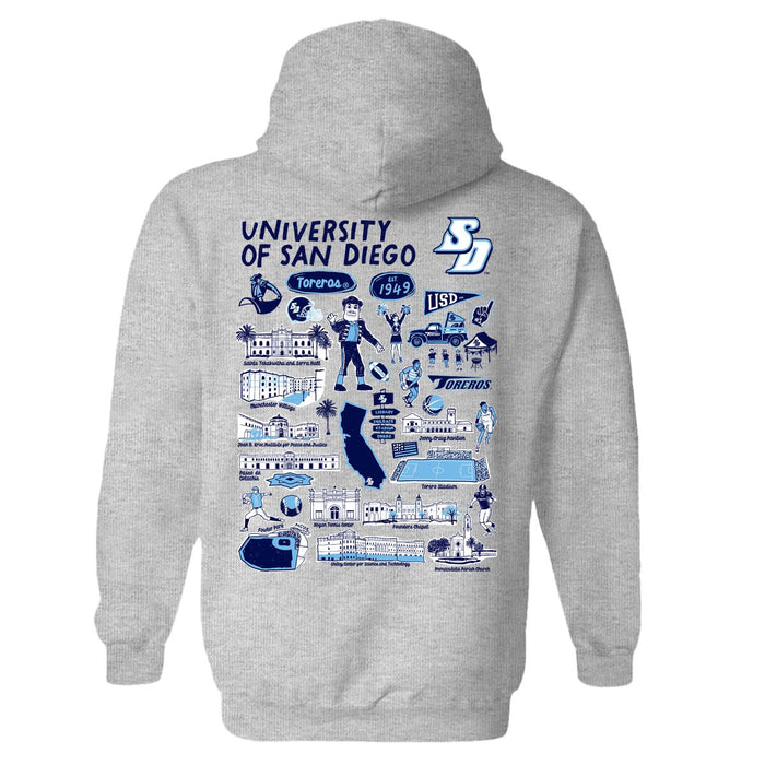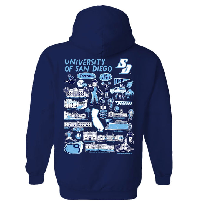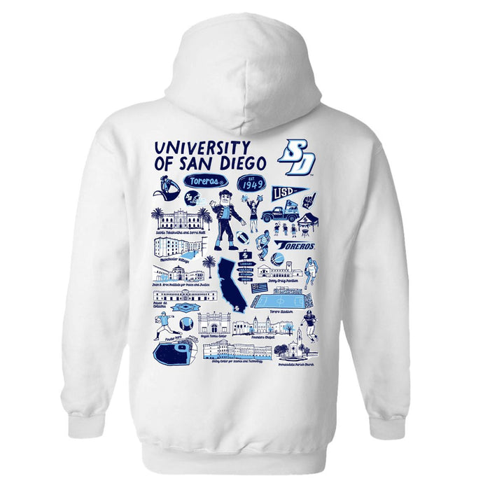 Back: A detailed, artistic print celebrating the most iconic places and traditions of University of San Diego making it a must-have for students, alumni, and fans!