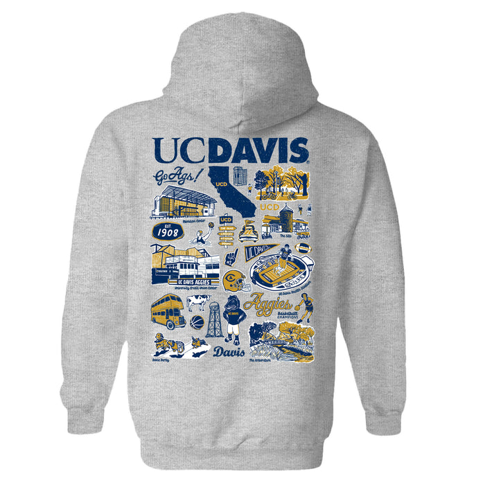 • Back: A detailed, artistic print celebrating the most iconic places and traditions of University of California, Davis making it a must-have for students, alumni, and fans!