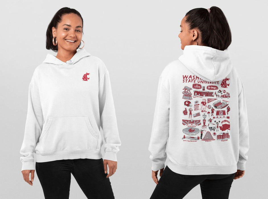 Back: A detailed, artistic print celebrating the most iconic places and traditions of Washington State University making it a must-have for students, alumni, and fans!