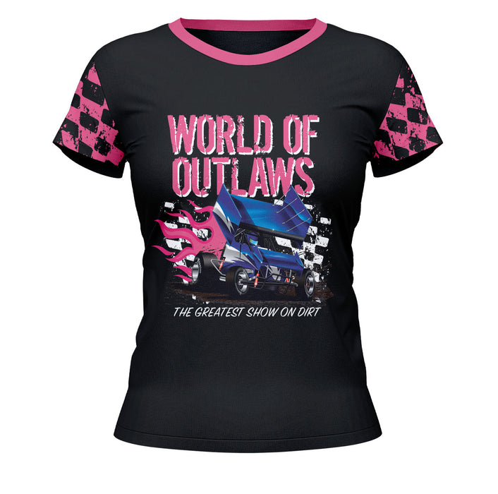 Look great with this new race team spirit women tee shirt. Go out, go to the race, and cheer loudly and proudly with his World of Outlaws gear by Vive La Fete.