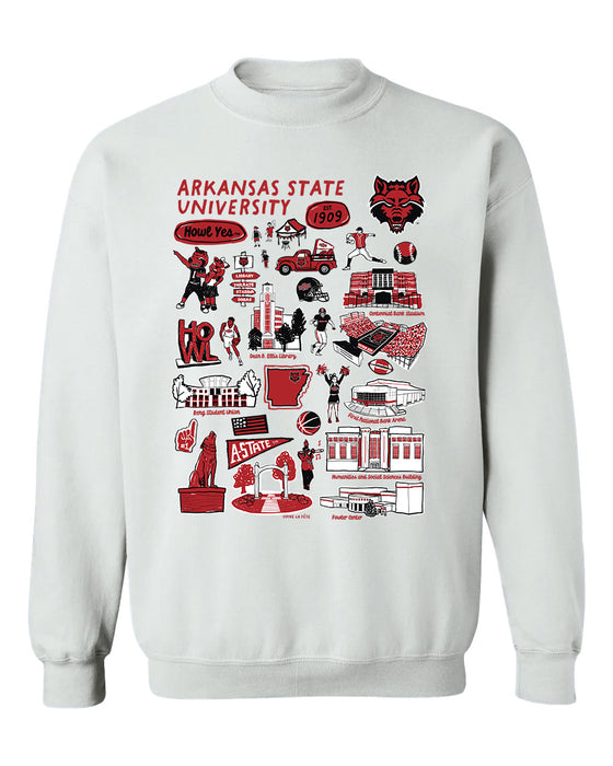 Show your school spirit in comfort and style with our officially licensed Arkansas State University Zips Campus Icons Crewneck Sweatshirt. This cozy fleece features our signature Impressions design on the front, showcasing the most iconic landmarks and traditions of Arkansas State Red Wolves – a perfect piece for fans, students, and alumni alike.