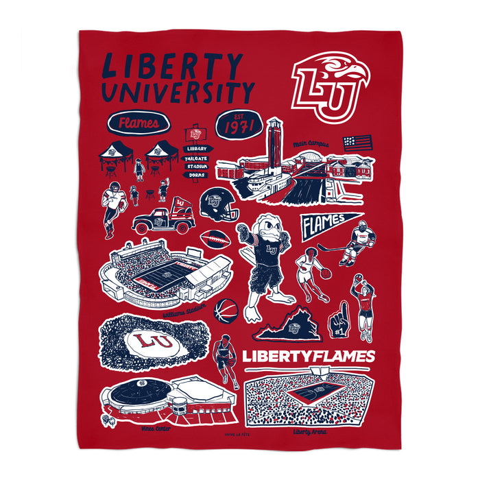Liberty University Flames Vive La Fete Impressions hand sketched artwork soft light weight fleece throw. Officially Licensed product sold by Vive La Fete. Soft and snuggly. Blanket measures 40” x 58”.