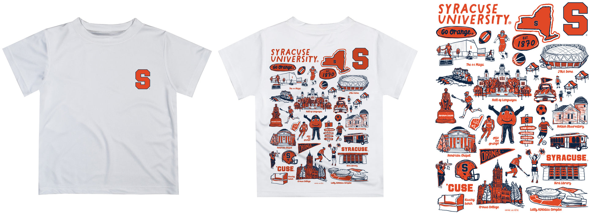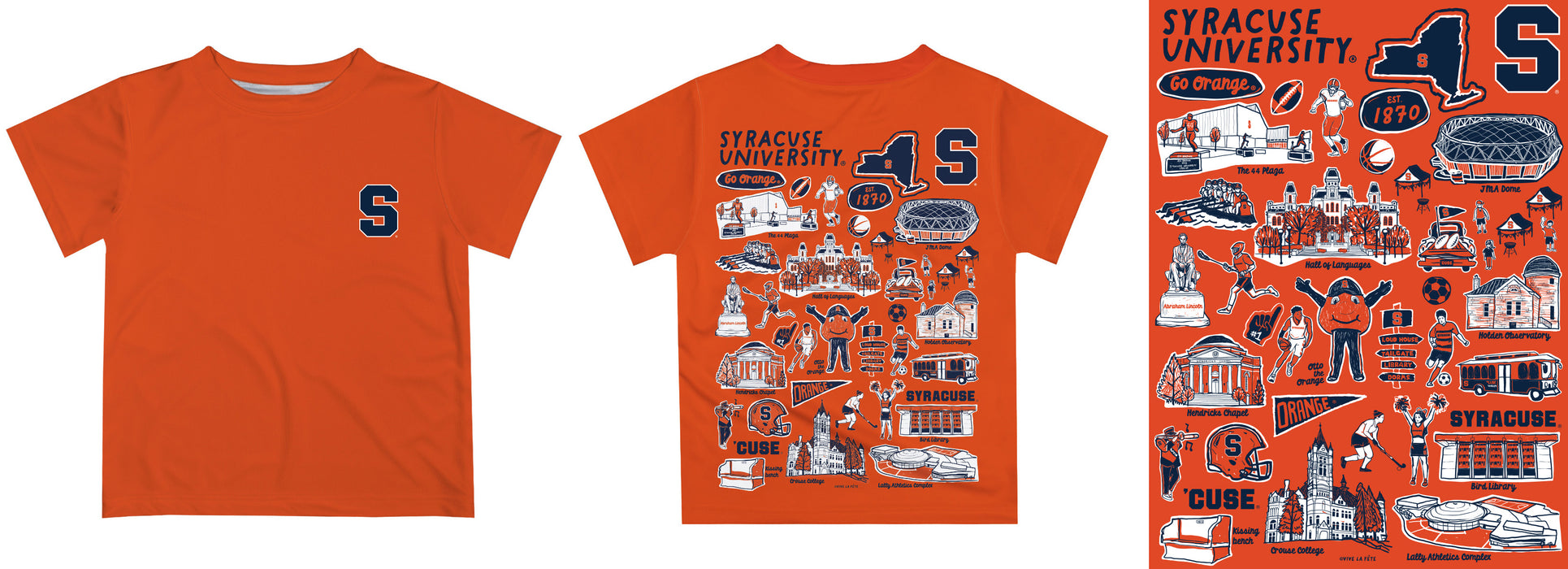 Let your kiddo look cool in his new Vive La Fete Impressions hand sketched artwork boys tee shirt. Let him play, go to the game, and cheer loudly and proudly with his Syracuse University Orange gear by Vive La Fete.