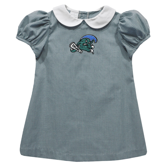 Tulane Green Wave Embroidered Hunter Green Gingham Short Sleeve A Line Dress